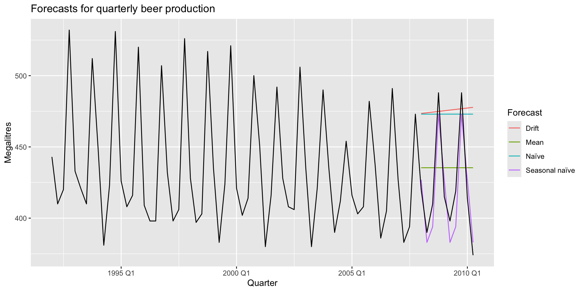 aus_production. Filter such that year is \(\geq\) 1992. Then define the period 1992-2007 as the training set:autoplot() and add in observed data:
