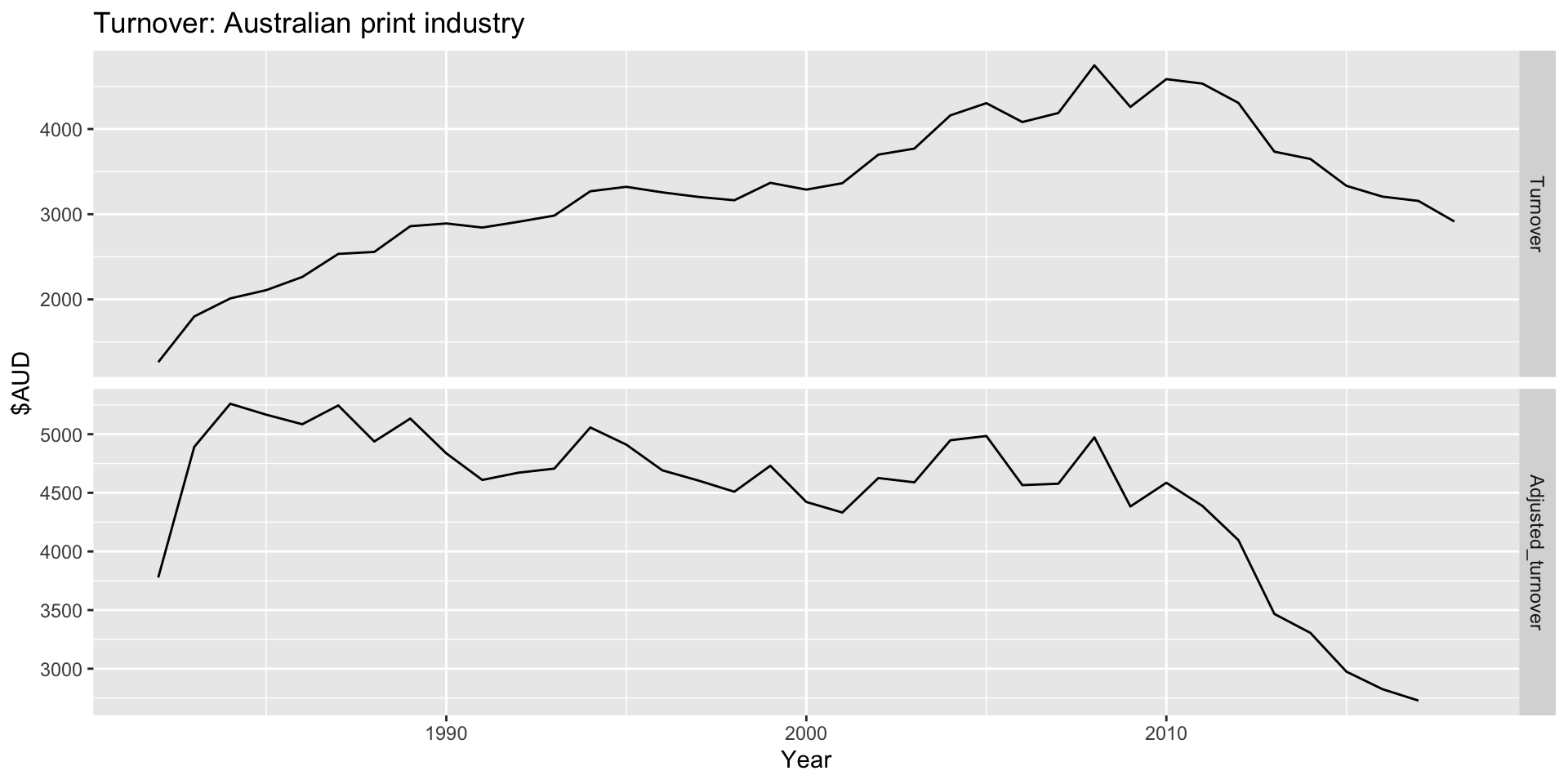 aus_retail dataset gives retail turnover in $Million AUD. Let’s inflation-adjust that series.