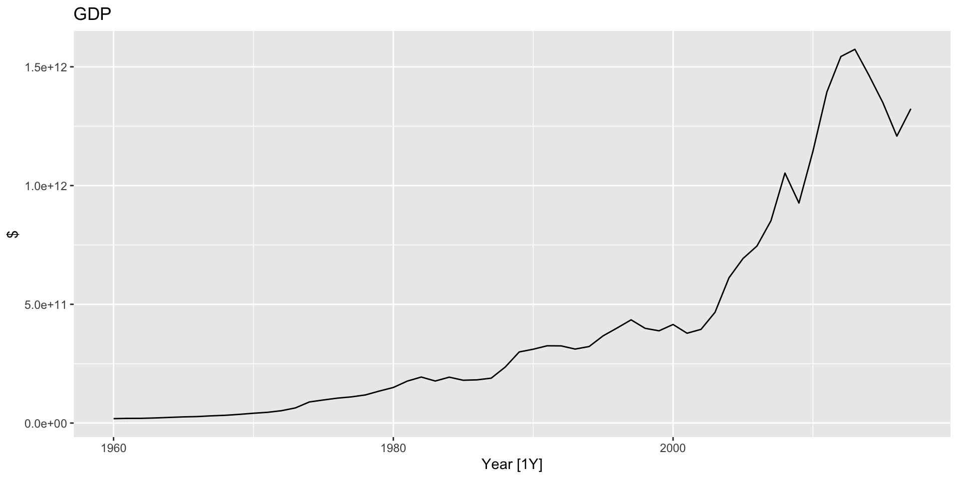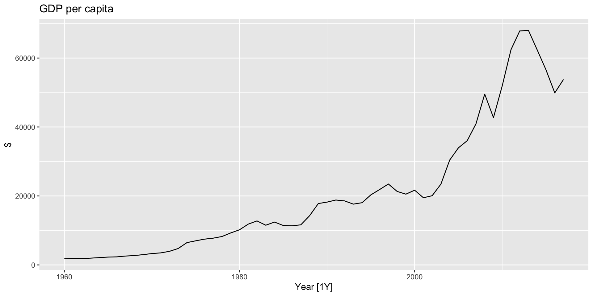 global_economy to make a time plot of US GDP and US per-capita GDP.