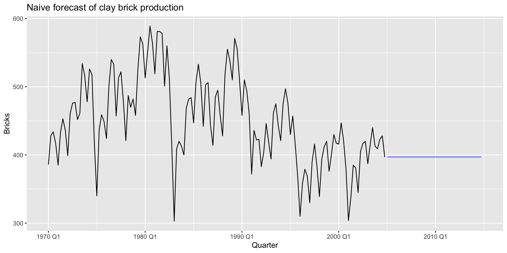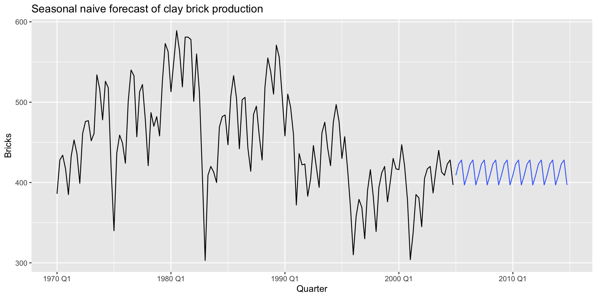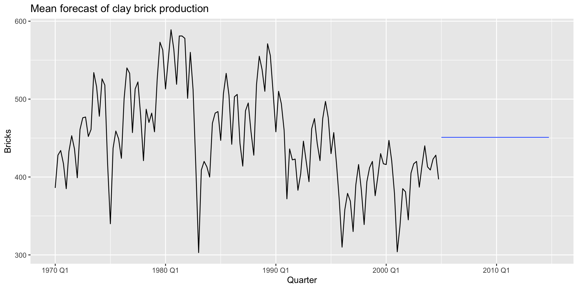 select() to restrict attention only to Bricks:model(MEAN()) allows us to implement the mean method easily:model(MEAN()) allows us to implement the mean method easily:model(NAIVE()):model(NAIVE()):model(NAIVE()):model(NAIVE()):model(SNAIVE()):# A fable: 40 x 4 [1Q]
